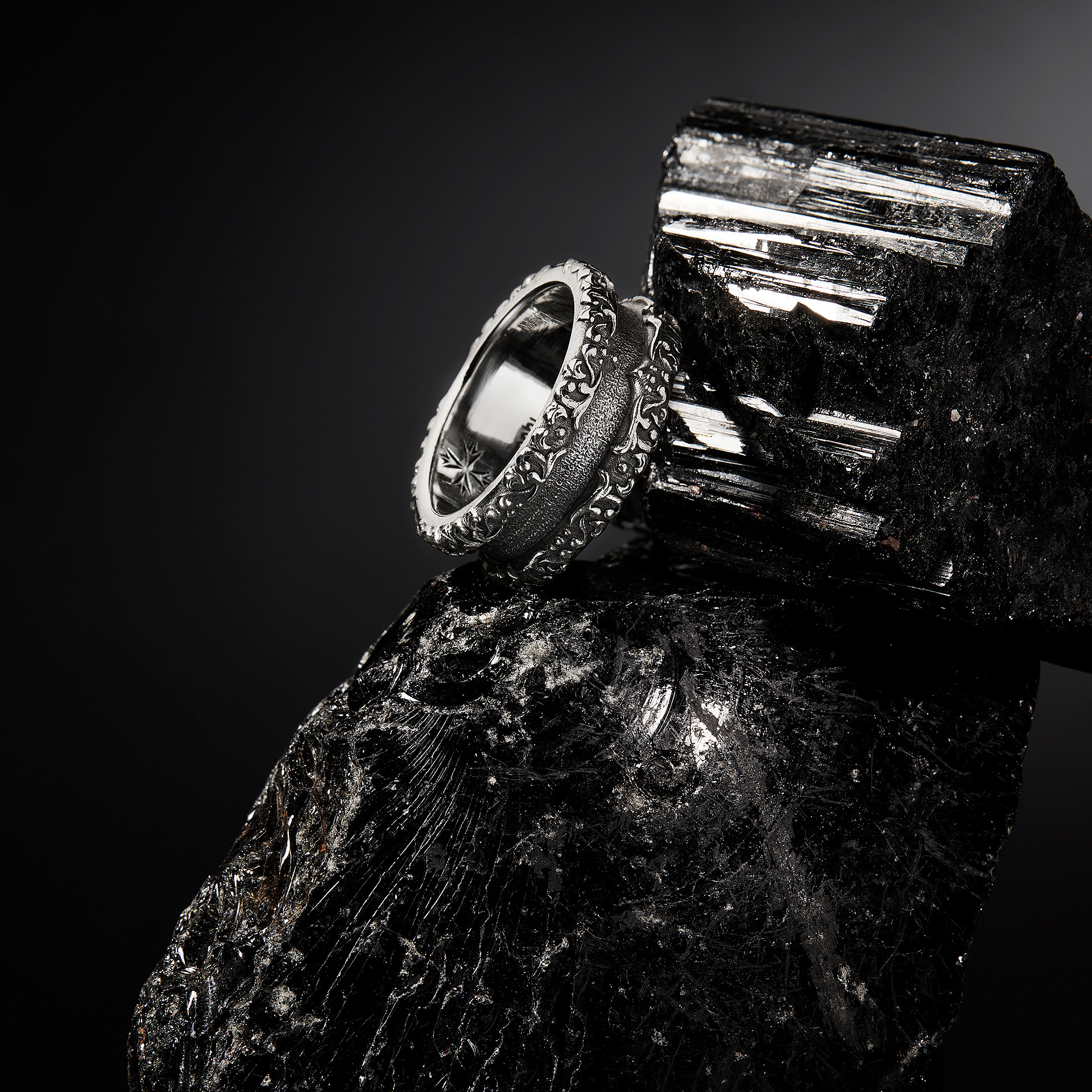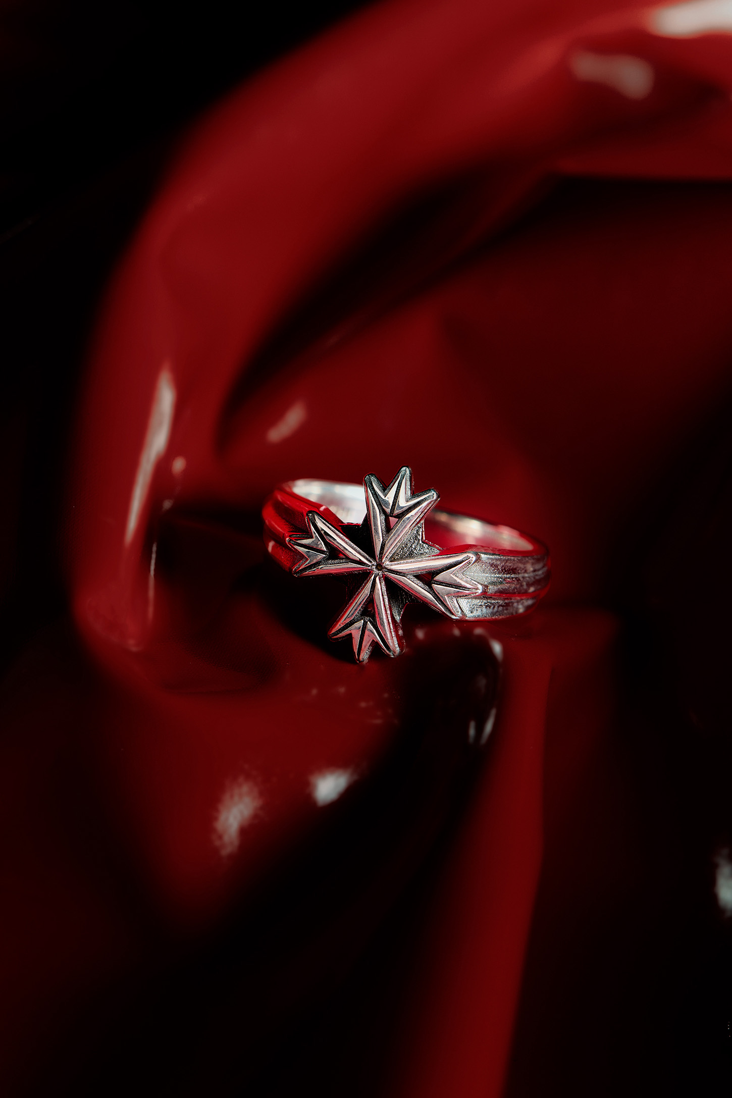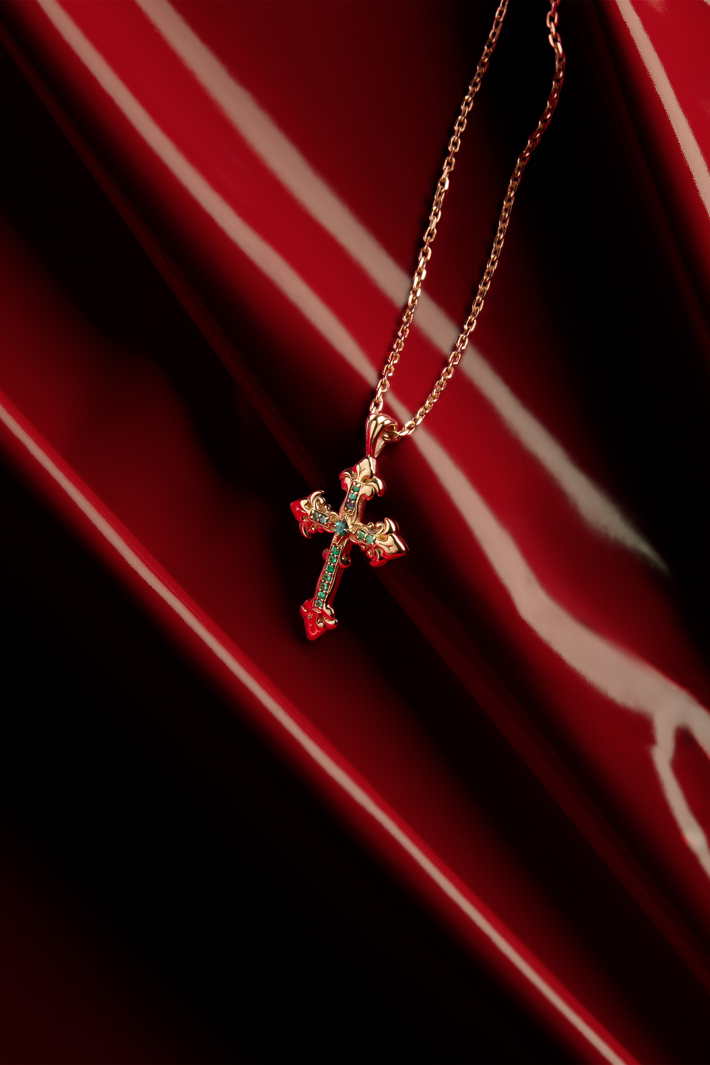 An intense and highly recognizable visual identity defines this digital campaign. Metallic red finishes and deep black backgrounds interact with material rocks, metal surfaces, and dark textiles, shaping an androgynous, powerful, and contemporary aesthetic. A luxury still life jewelry production that enhances texture, light, and matter with technical precision and a strong visual signature.