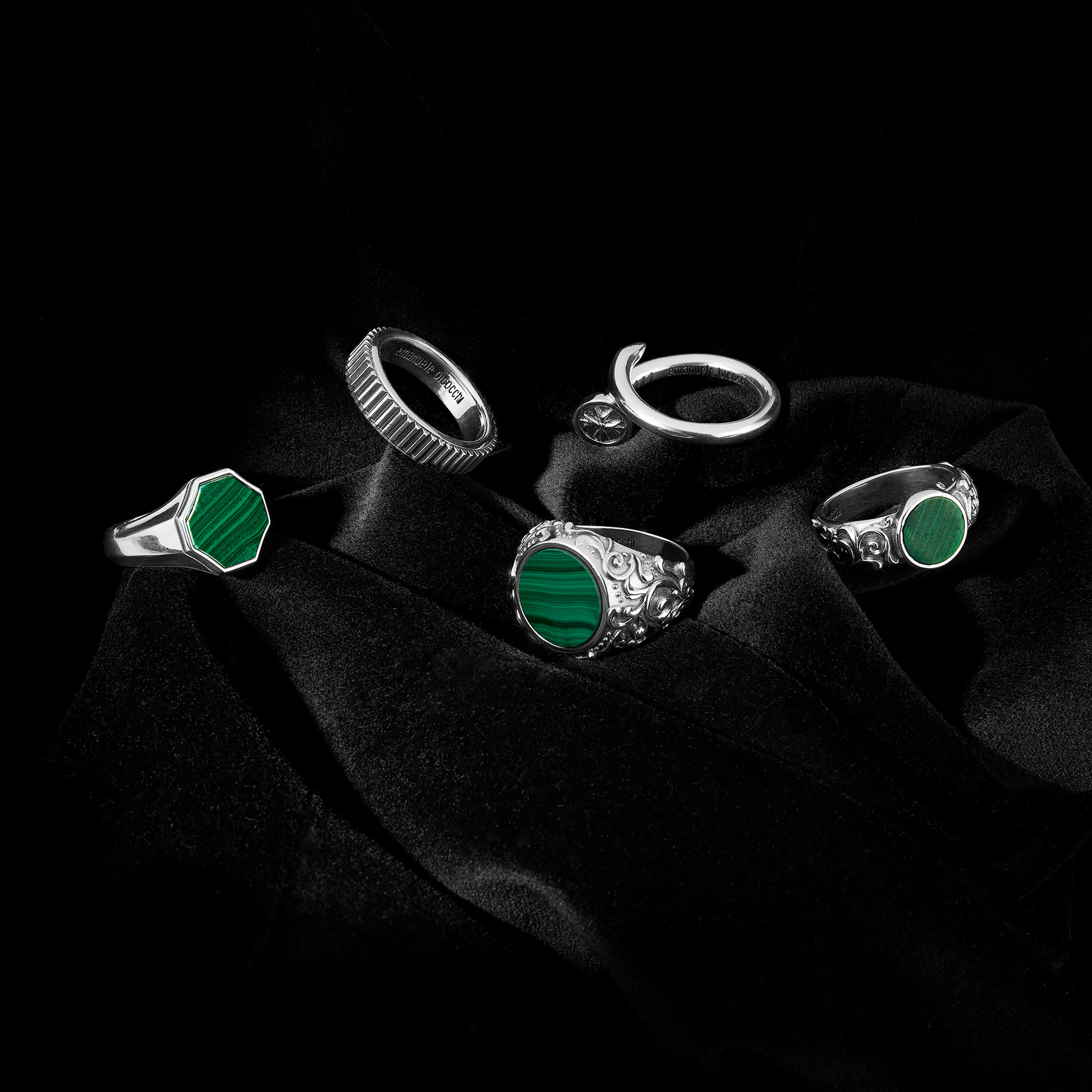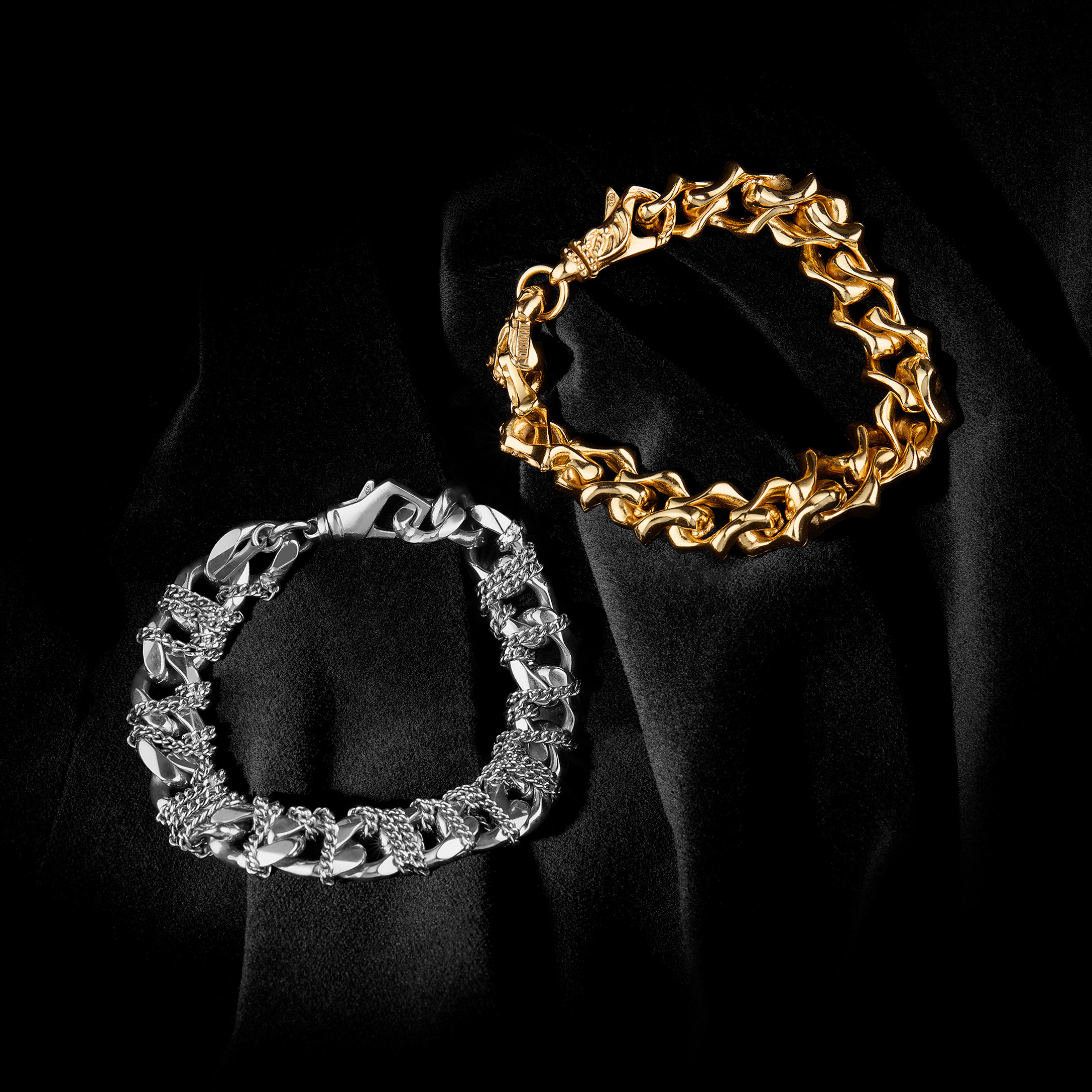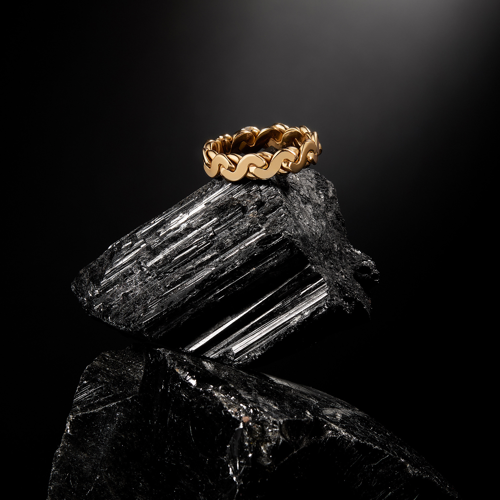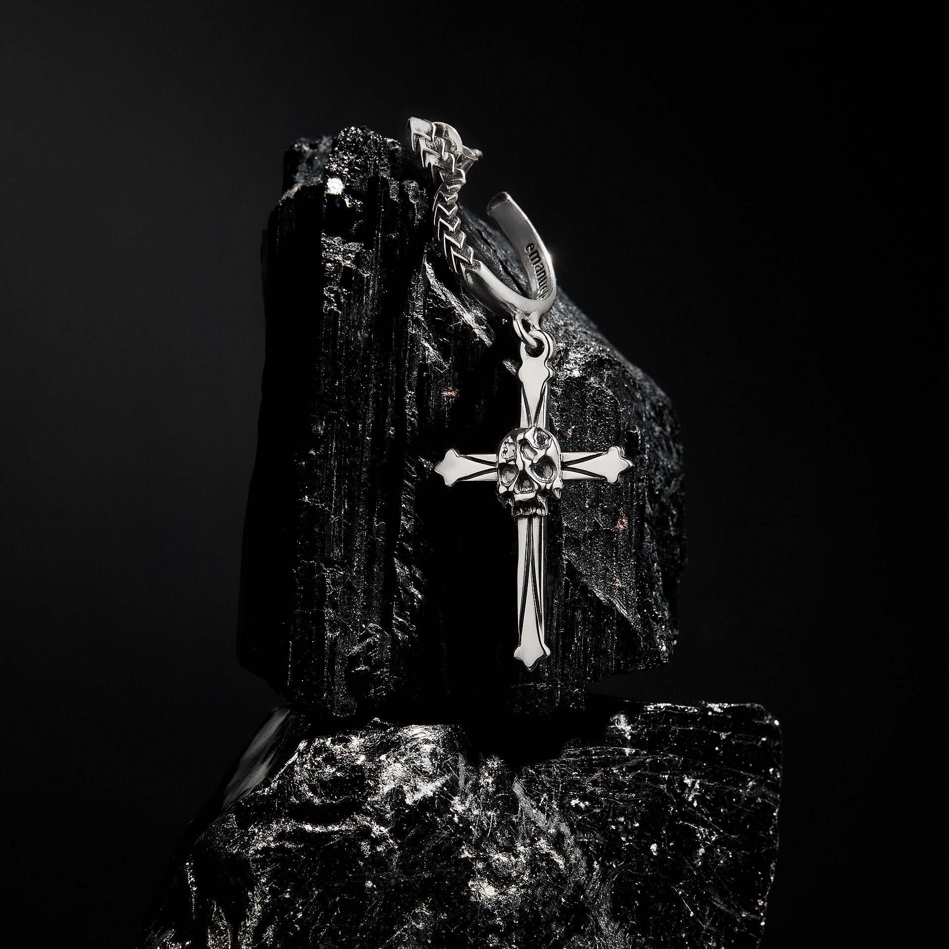 An intense and highly recognizable visual identity defines this digital campaign. Metallic red finishes and deep black backgrounds interact with material rocks, metal surfaces, and dark textiles, shaping an androgynous, powerful, and contemporary aesthetic. A luxury still life jewelry production that enhances texture, light, and matter with technical precision and a strong visual signature.